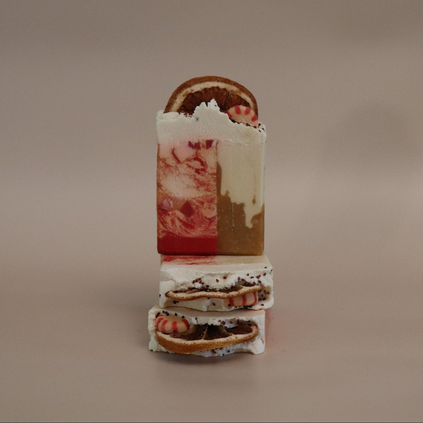 Fresh, festive, and full of holiday spirit, Citron blends the invigorating notes of orange and peppermint for a bright, cheerful scent that instantly uplifts. Its striking half and half design features one side in warm orange and white swirls, the other in red and white, all topped with whipped soap frosting, a sprinkle of peppermint, and a touch of dried orange peel for a candy-citrus finish. Enriched with orange peel powder, this bar gently exfoliates and helps promote radiant, glowing skin while the creamy lather leaves you feeling refreshed and nourished.