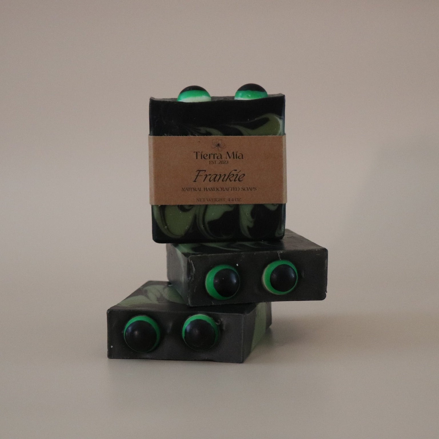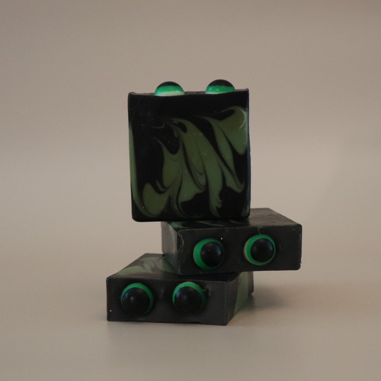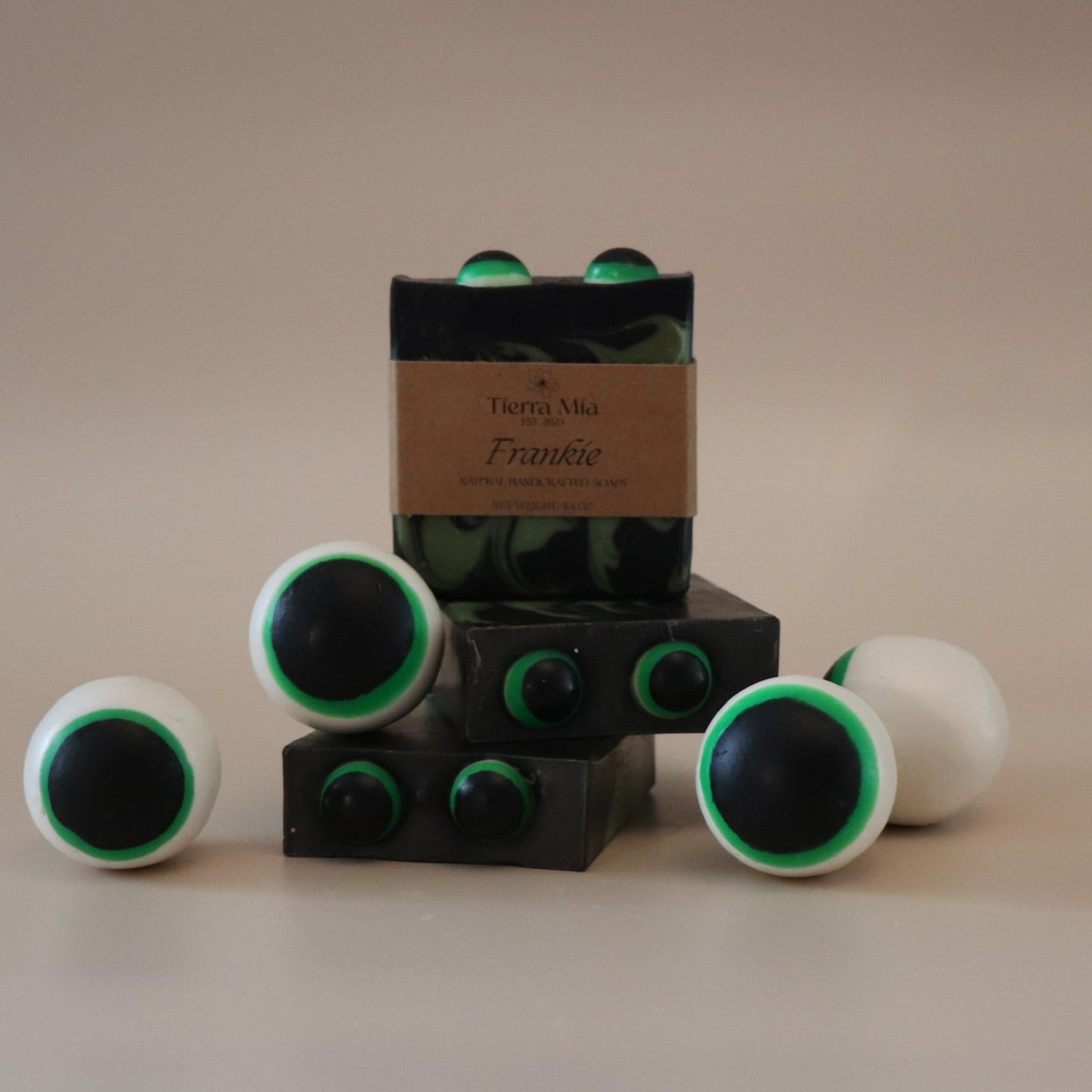 A playful Halloween soap bar with a swirl of spooky greens and blacks. Named after a classic monster, Frankie is scented with a clean, light minty smell lifted by soft floral and citrus notes. Its deep, meditative aroma feels simple, perfect for moments of calm and self-connection. Made with Activated Charcoal to detoxify your skin and a refreshing scent blend to awaken your senses. Whether you grab the swirled black and green bar with watchful eyes and essential oil blend or the eerie eyeball fragrance oil version, this Halloween treat is sure to keep your skin soft while adding a little monster magic to your routine.