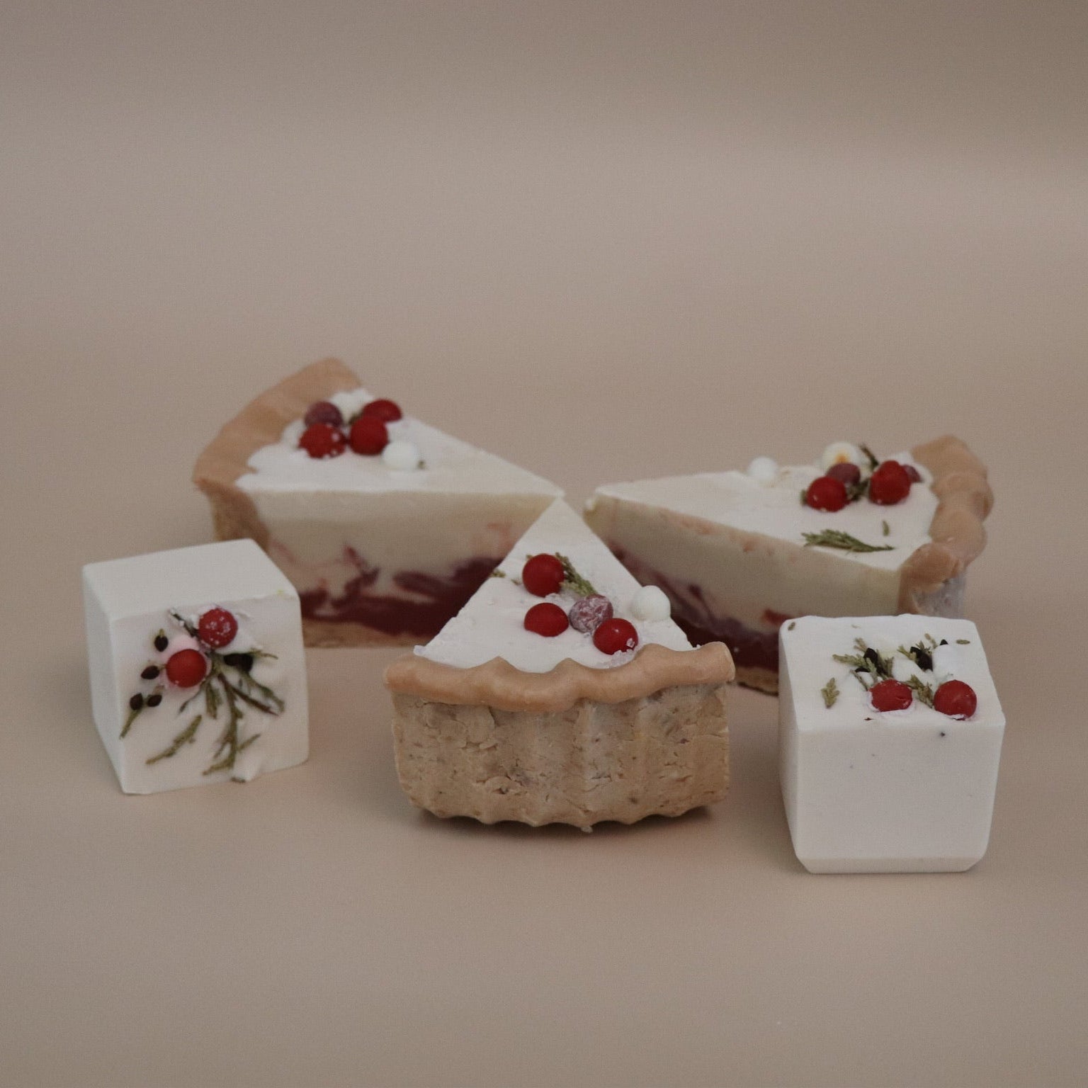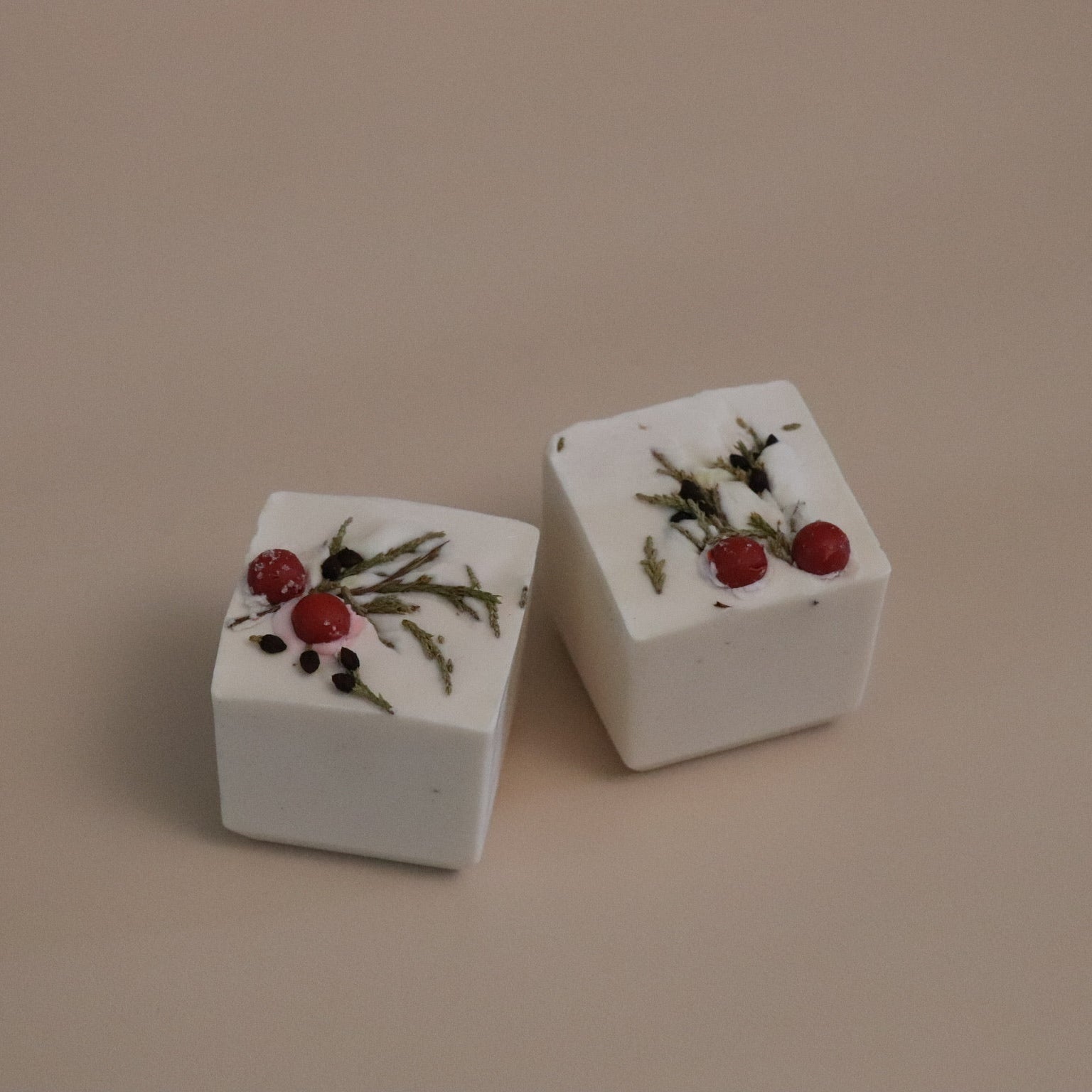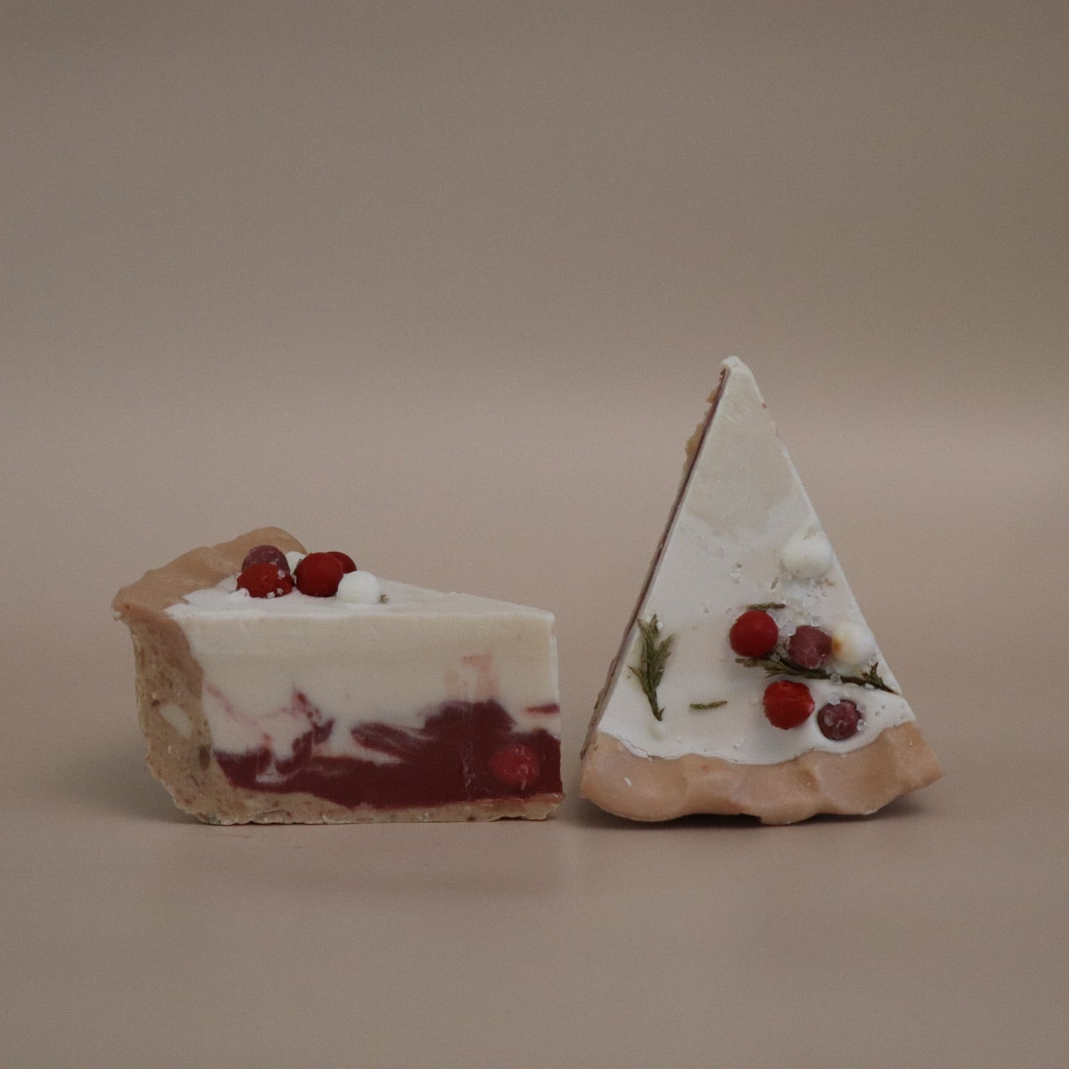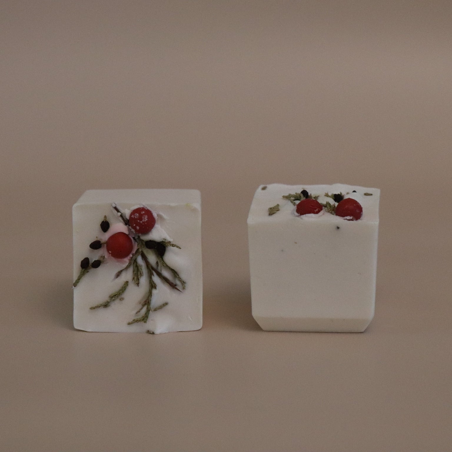 Sweet, festive, and irresistibly charming, Gloria is inspired by a cranberry tart dessert. Available as a layered tart-style bar topped with cranberries or a white cube version with cranberries on top. The scent is a joyful botanical blend of Siberian fir and warm cedar, layered with hints of citrus and sugared berries, finishing with subtle notes of amber, vanilla, and soft moss. Enriched with Cranberry Extract Powder, this bar helps gently exfoliate and brighten the skin while nourishing it with rich botanical oils and butters.