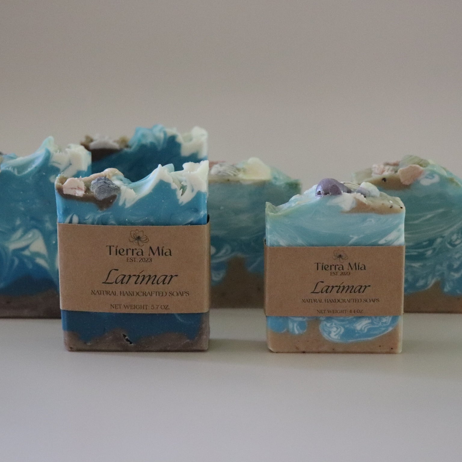Named after the stunning Caribbean gemstone, this ocean-inspired bar features swirls of aqua blue, sandy beige, and foam-white. "Larimar" comes in two distinct variations, an "All Natural" essential-oil only version and an original lively, fragranced version. Both are infused with Volcanic Pumice and Coffee Grounds for gentle exfoliation.