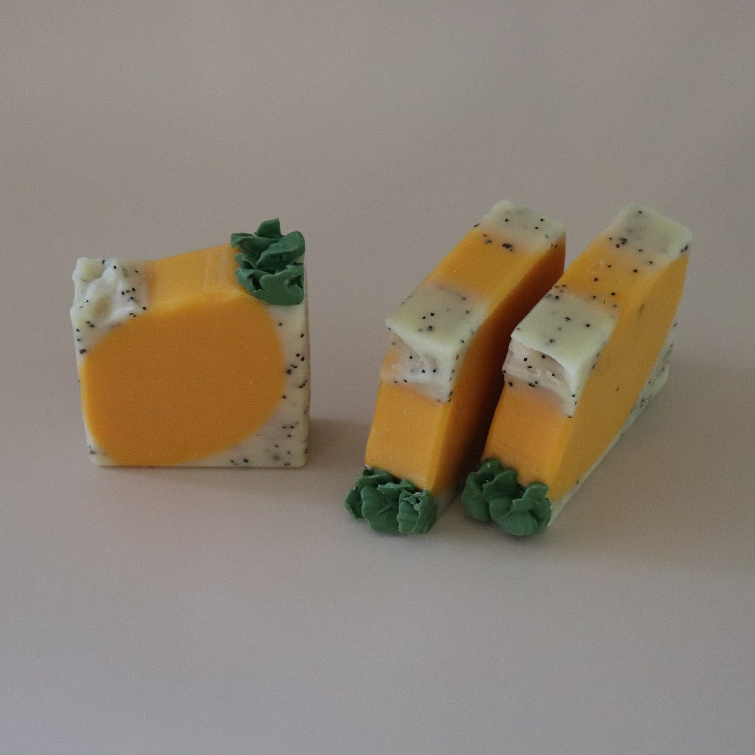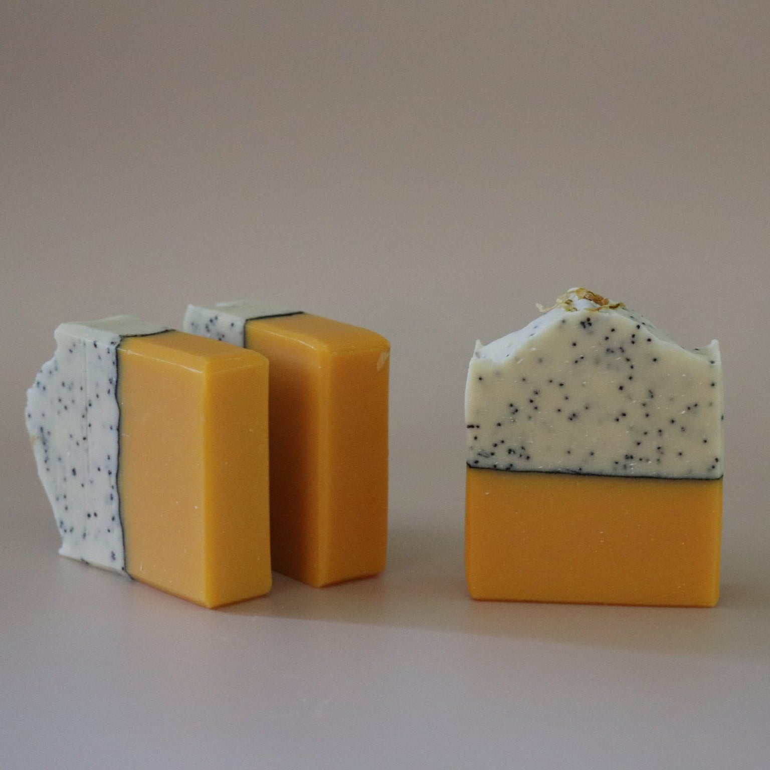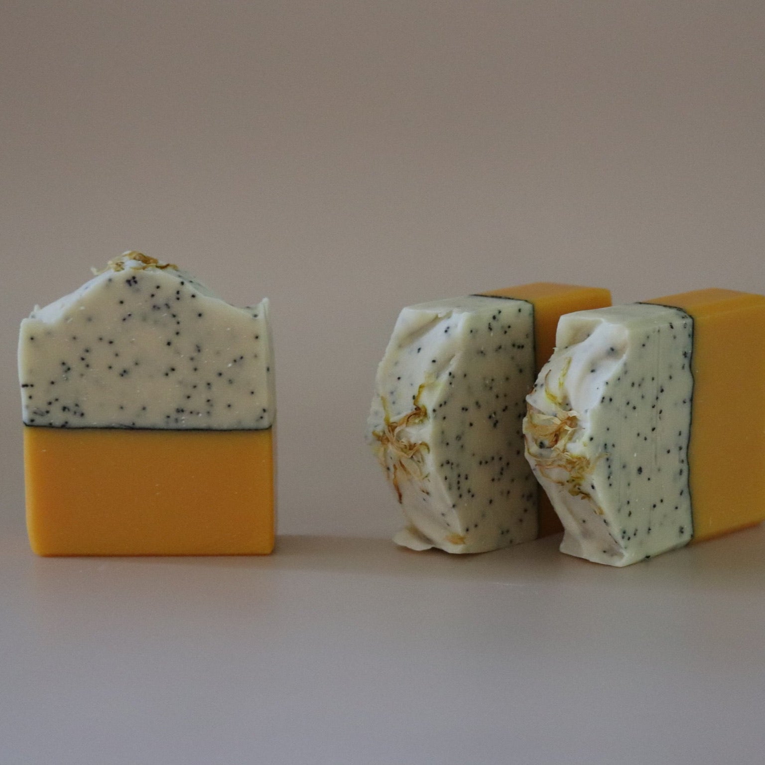 Olive Oil, Annato Oil, Tallow, Coconut Oil, Castor Oil, Shea Butter, Beeswax, Citric Acid, Sodium Lactate, Lemon Juice, Kaolin Clay, Poppy Seeds, Sodium Hydroxide, Distilled Water, Essential Oil