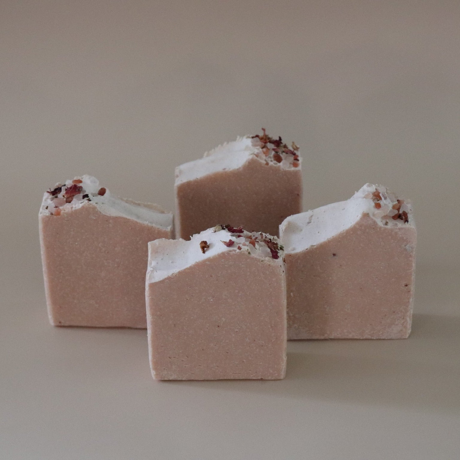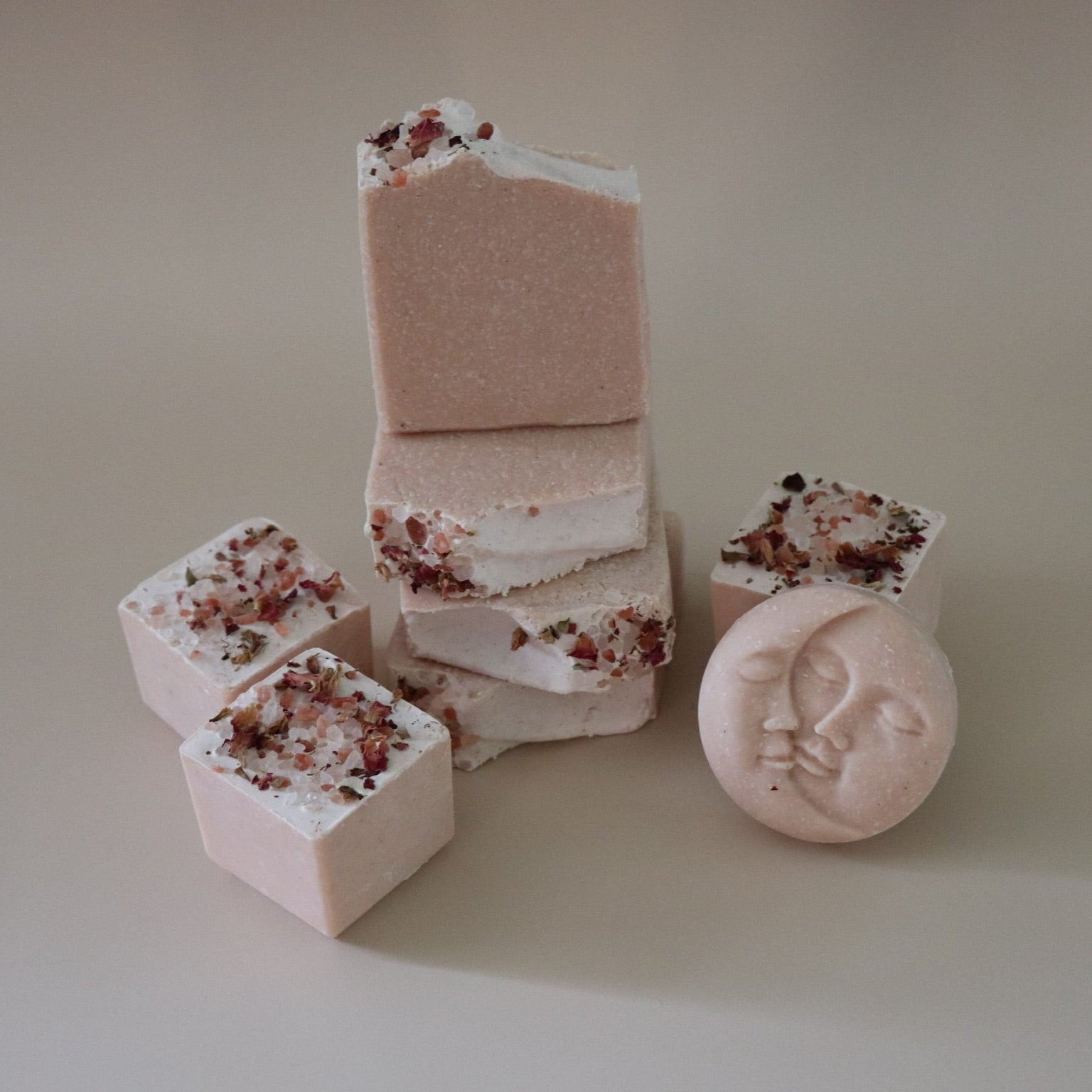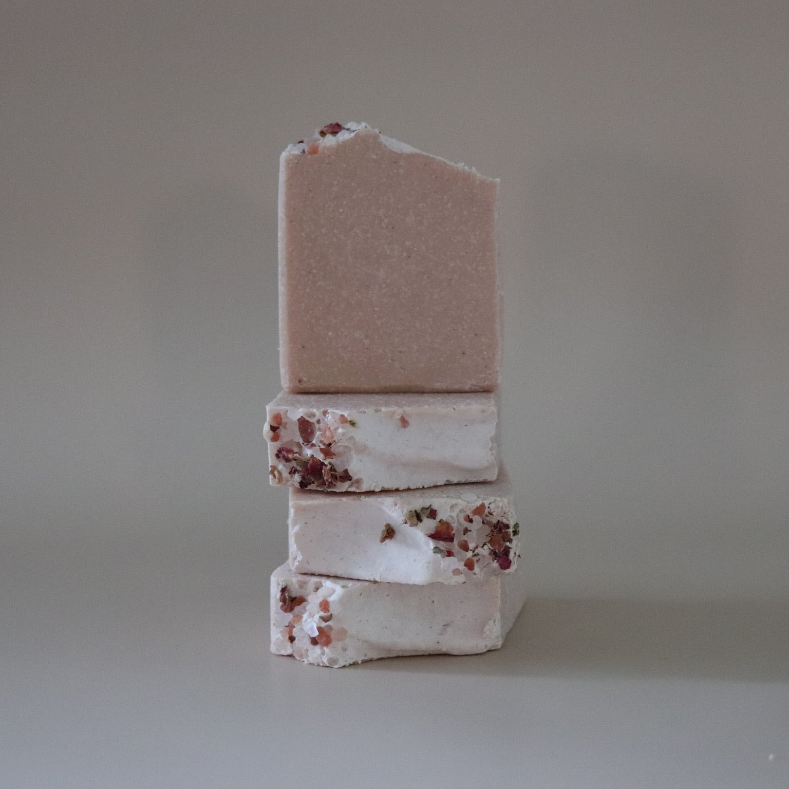 Pink: Coconut Oil, Olive Oil, Shea Butter, Avocado Oil, Castor Oil, Himalayan Salt, Kaolin Clay, Rose Clay, Citric Acid, Sodium Hydroxide, Distilled Water, Essential Oil