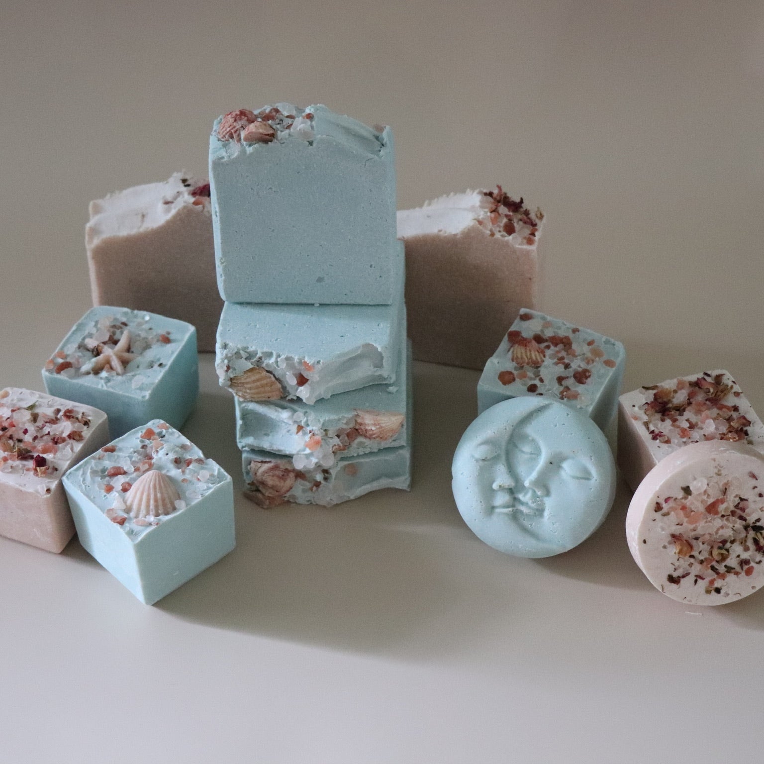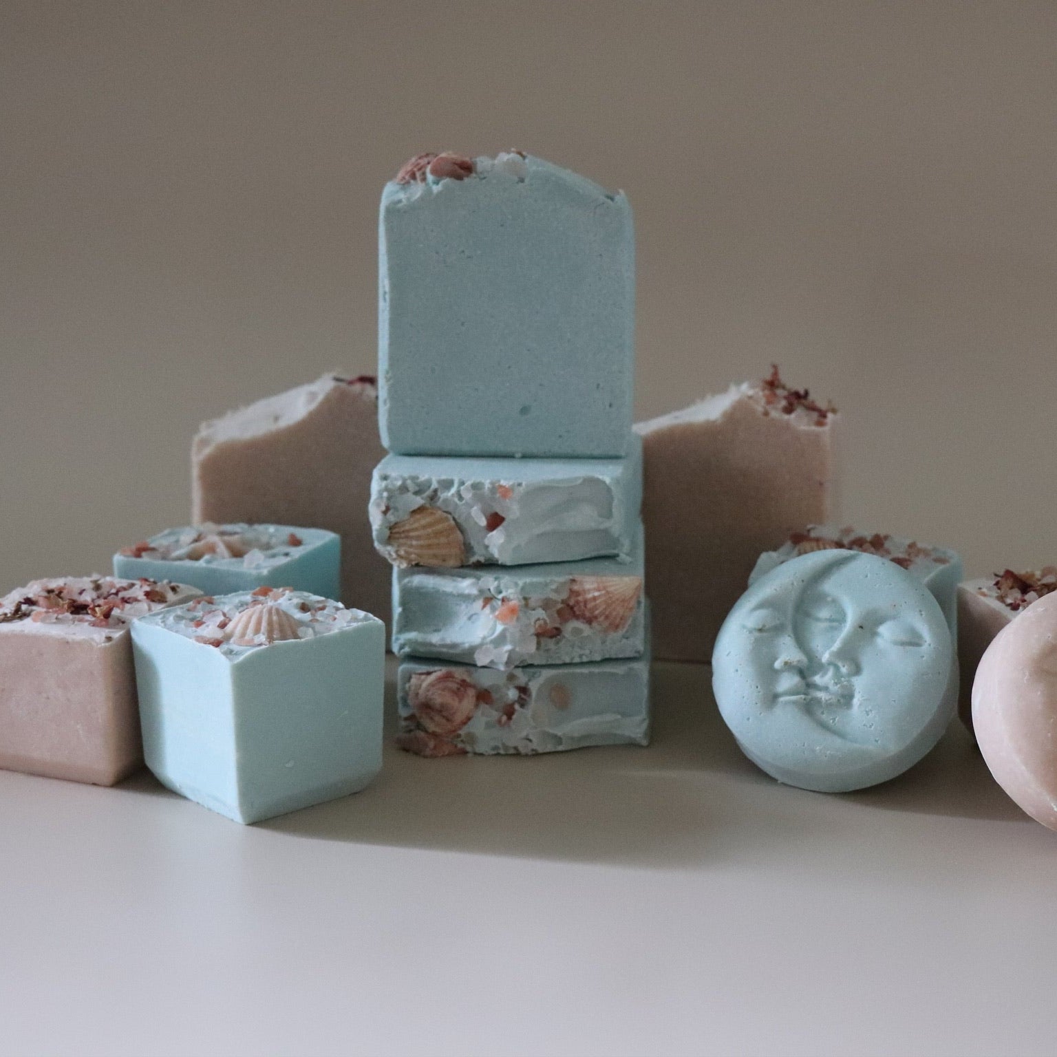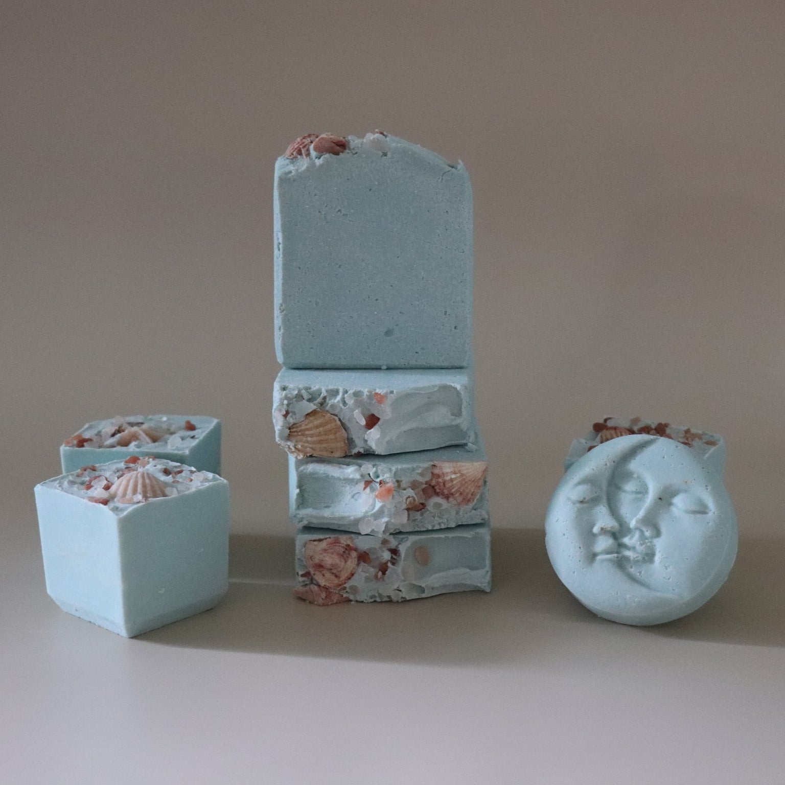 "Marina” is a coastal spa getaway wrapped in a bar of soap. Coming in two beautifully distinct variations, both soap bars are rich in minerals from either Himalayan Salt or Mediterranean Sea Salt. As well as being infused with a luxurious blend of essential oils such as bergamot, peppermint, eucalyptus, and benzoin, creating a refreshing and aromatic cleanse. This bar exfoliates and purifies the skin. Rose Clay & Blue Clay gives it a dreamy pink or blue hue. Swirled with Kaolin Clay, it leaves your skin smooth, refreshed, and beautifully toned. It’s your perfect post-beach detox, balancing both body and mind.