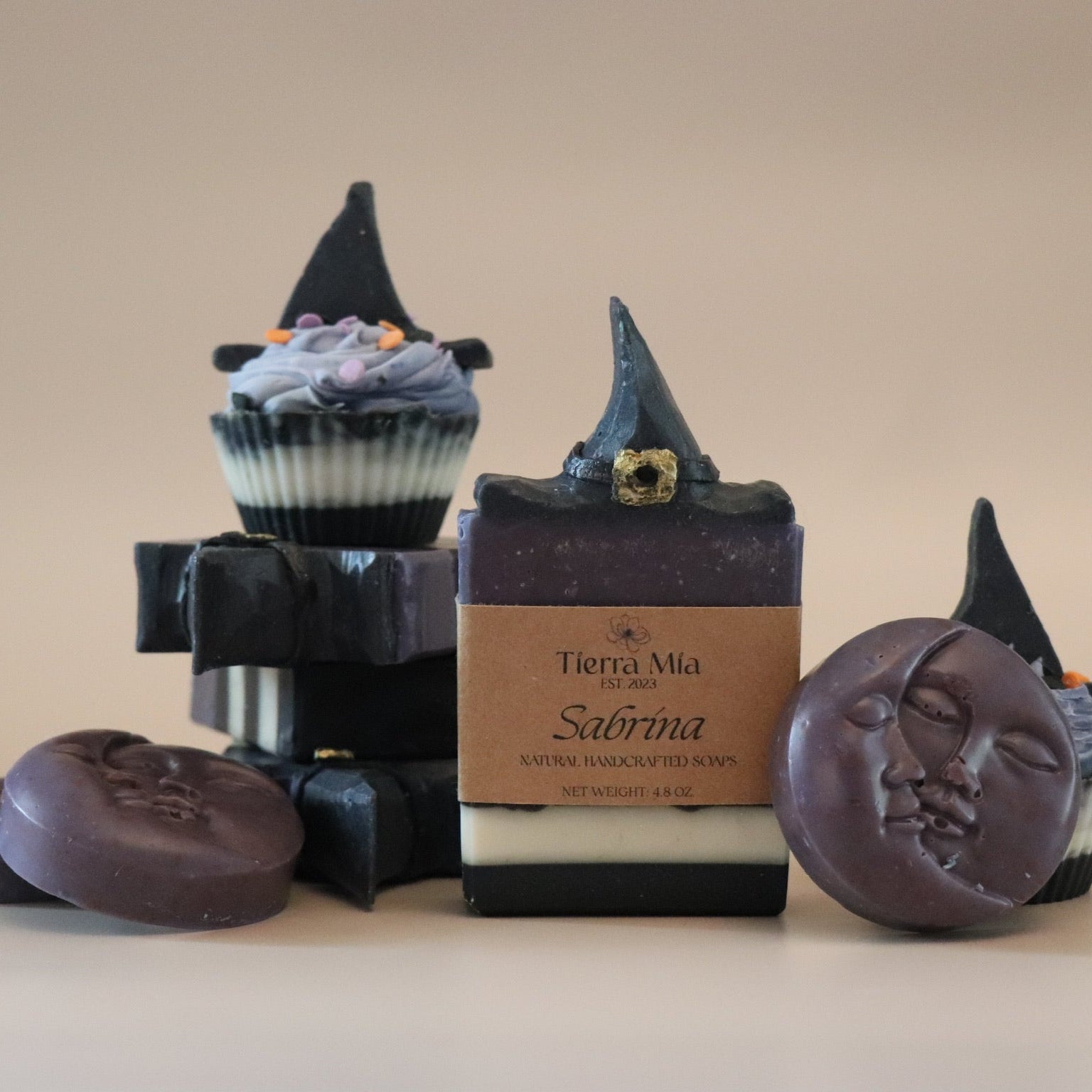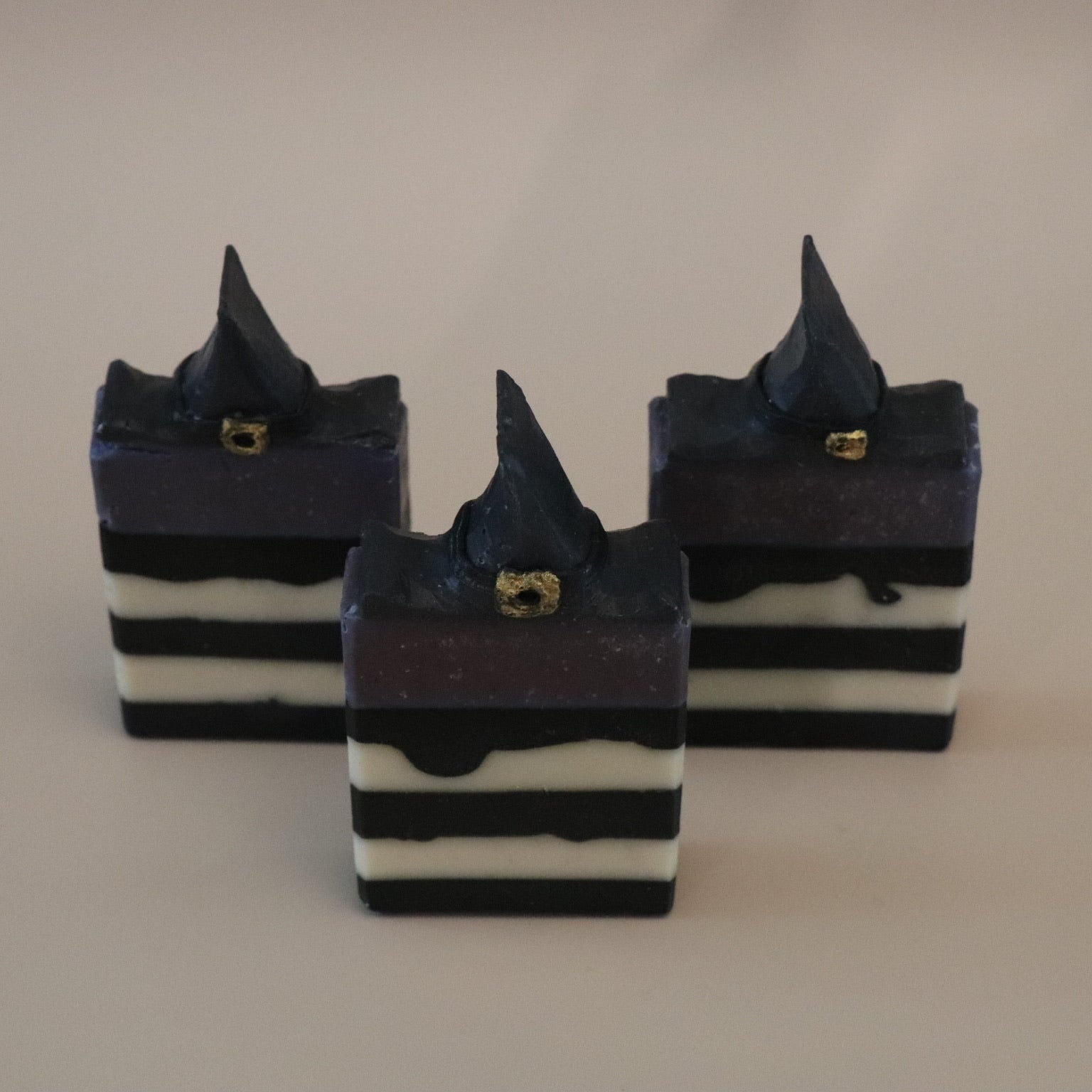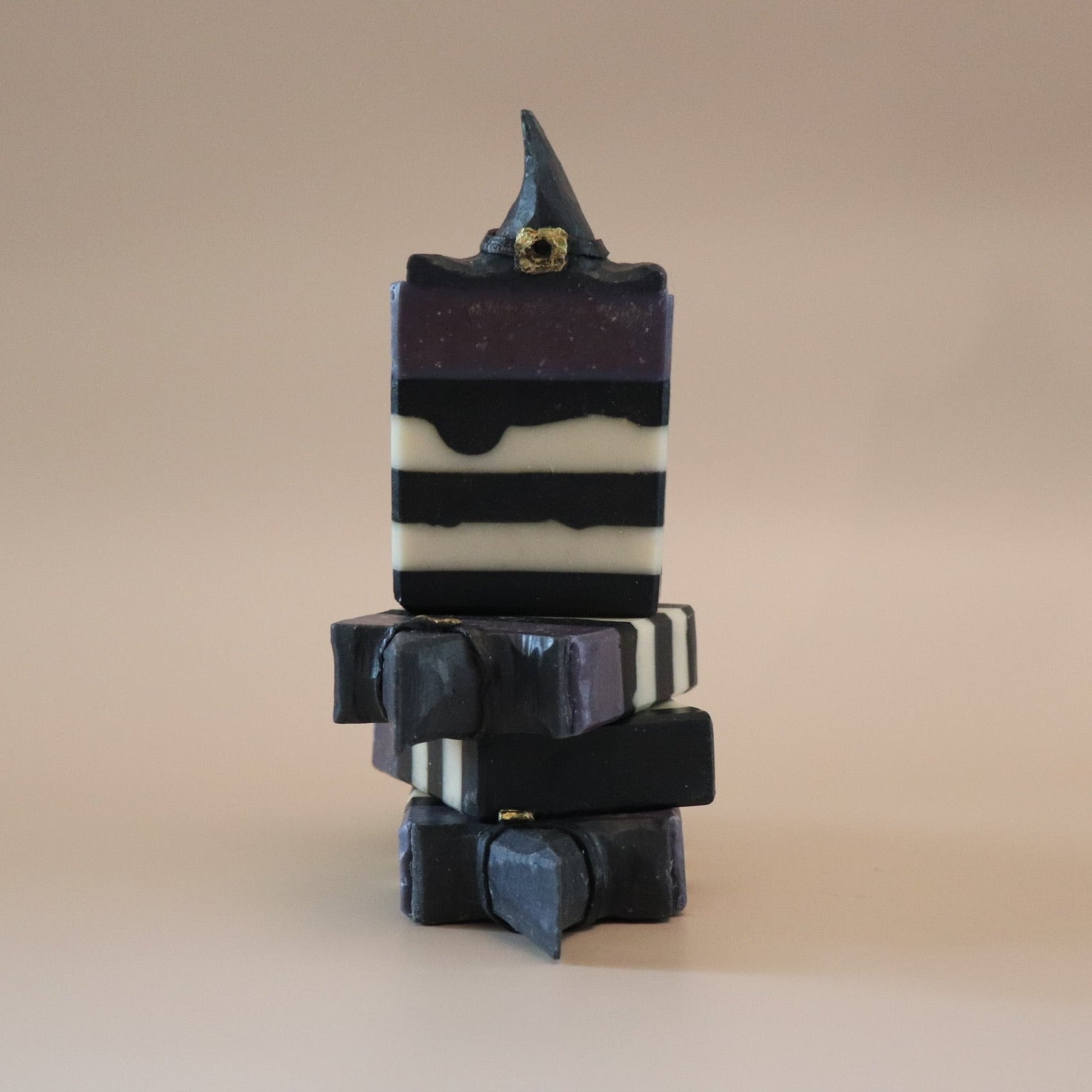 Dark, mysterious, and magical. "Sabrina" is striped in bold black and white with purple & witch hat + gold buckle topper. Perfect for Halloween displays and awakening your inner witch. Crafted with Activated Charcoal for deeply cleansing the skin and an enchanting mystical essential oil blend with spicy-sweet, licorice like aroma that feels like a witchy potion.