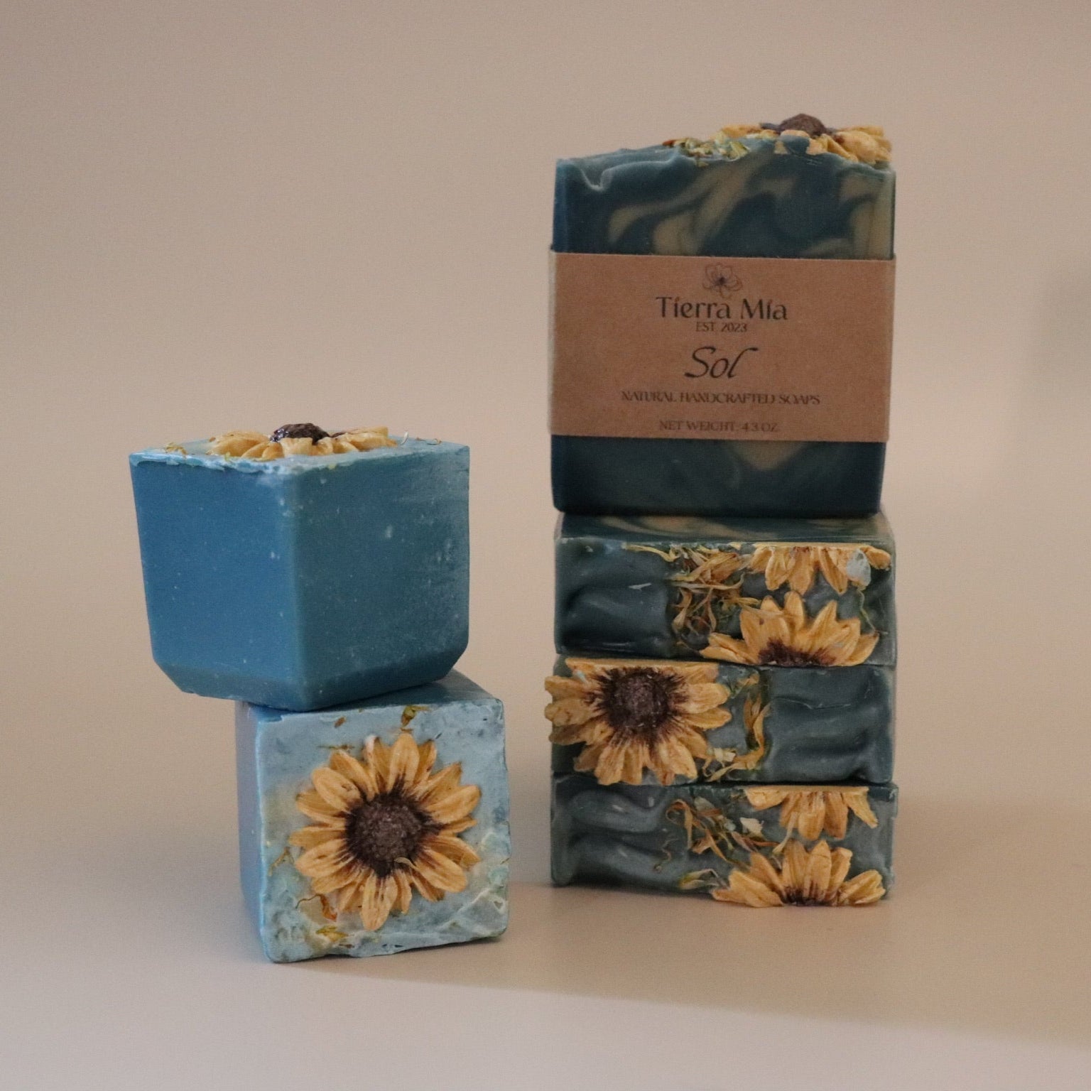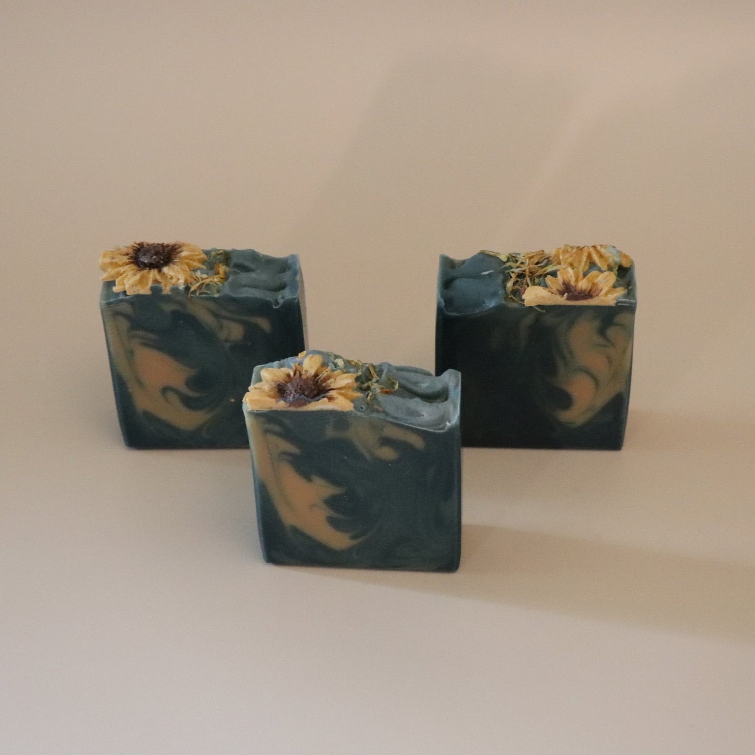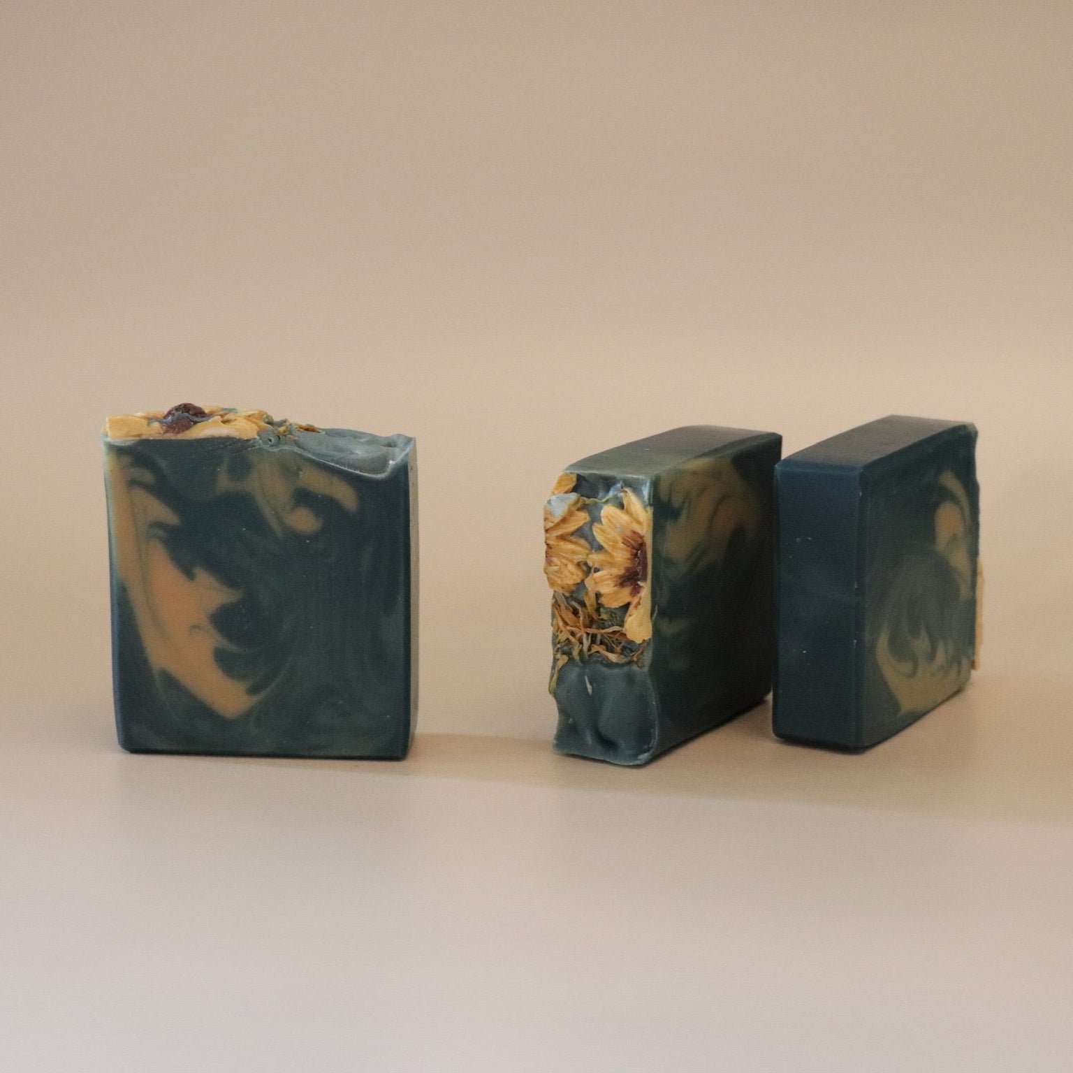 Warm and bright like autumn sunshine. Yellow and blue swirls topped with a sunflower and dried calendula petals. Sol is infused with Turmeric for brightening & even skin tone, Goat Milk & Coconut Milk for gentle cleansing & exfoliation. Golden & Uplifting, this soap bar delivers a pleasant, stimulating floral-citrus aroma using only essential oils.