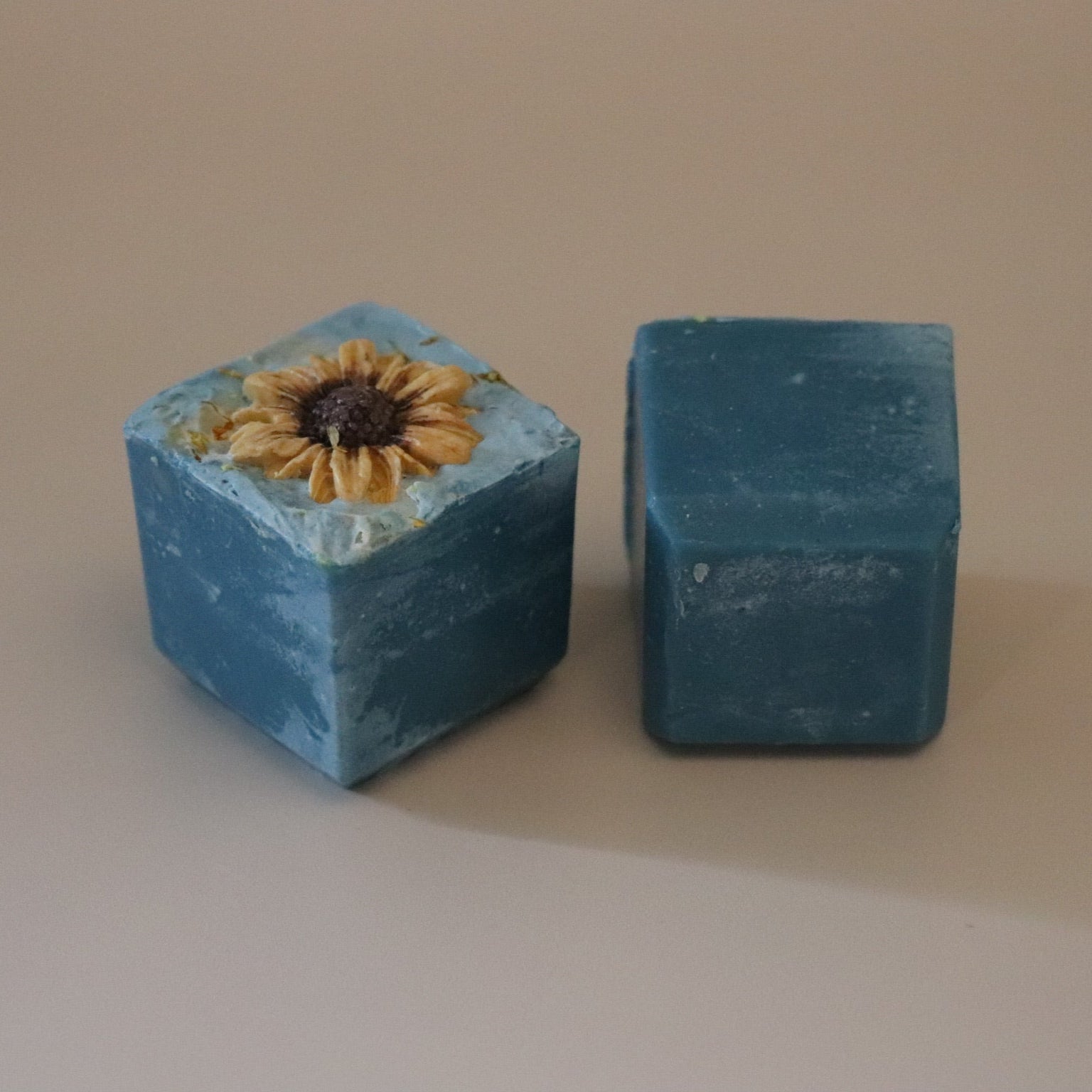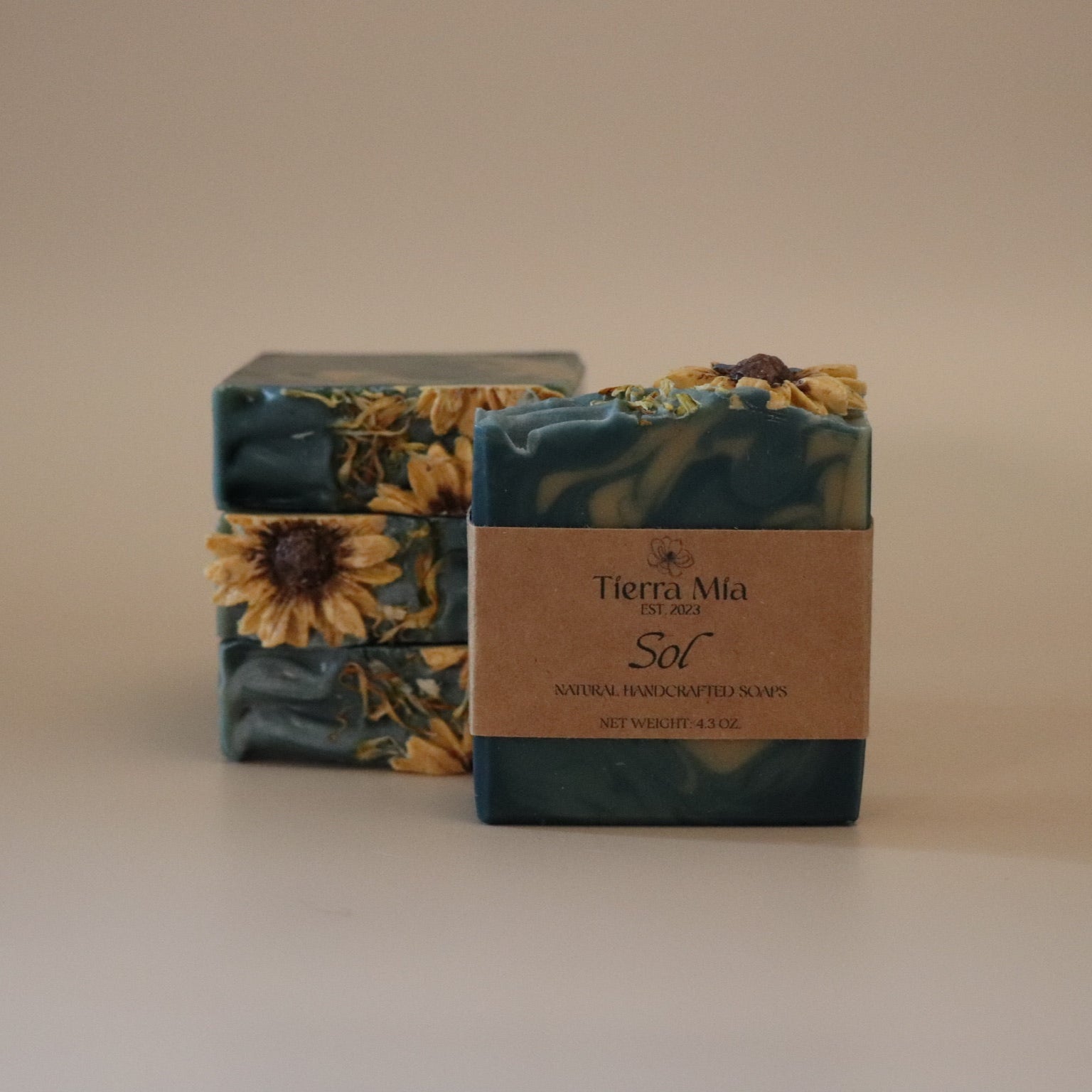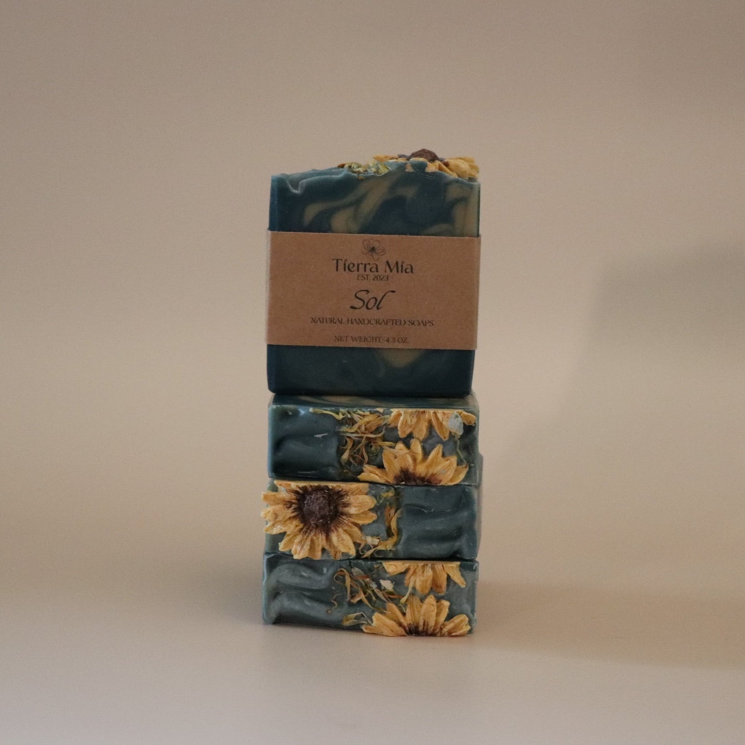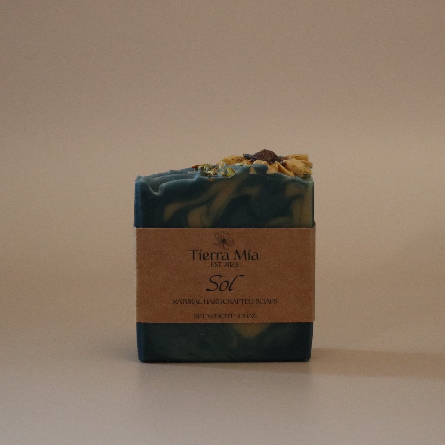 Warm and bright like autumn sunshine. Yellow and blue swirls topped with a sunflower and dried calendula petals. Sol is infused with Turmeric for brightening & even skin tone, Goat Milk & Coconut Milk for gentle cleansing & exfoliation. Golden & Uplifting, this soap bar delivers a pleasant, stimulating floral-citrus aroma using only essential oils.