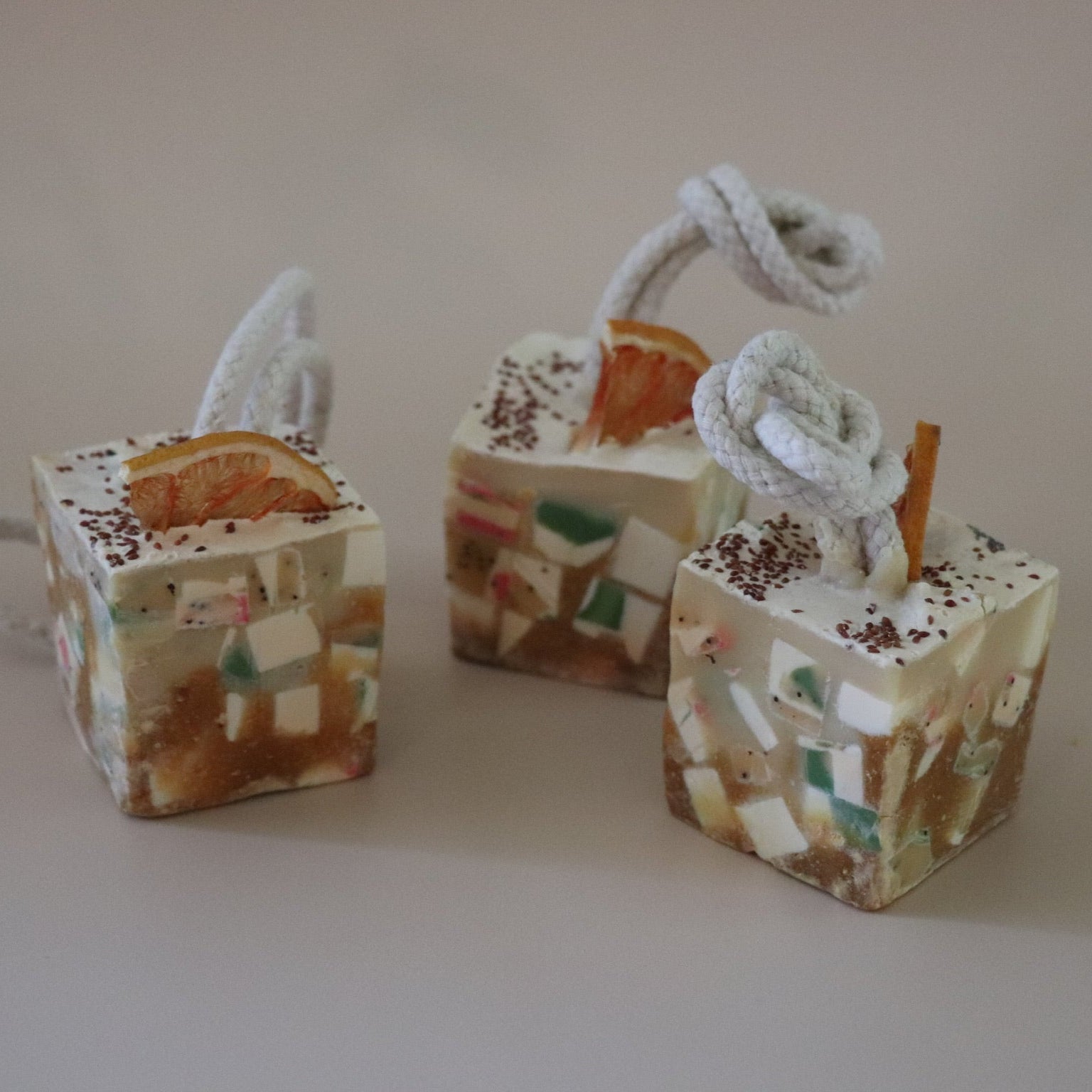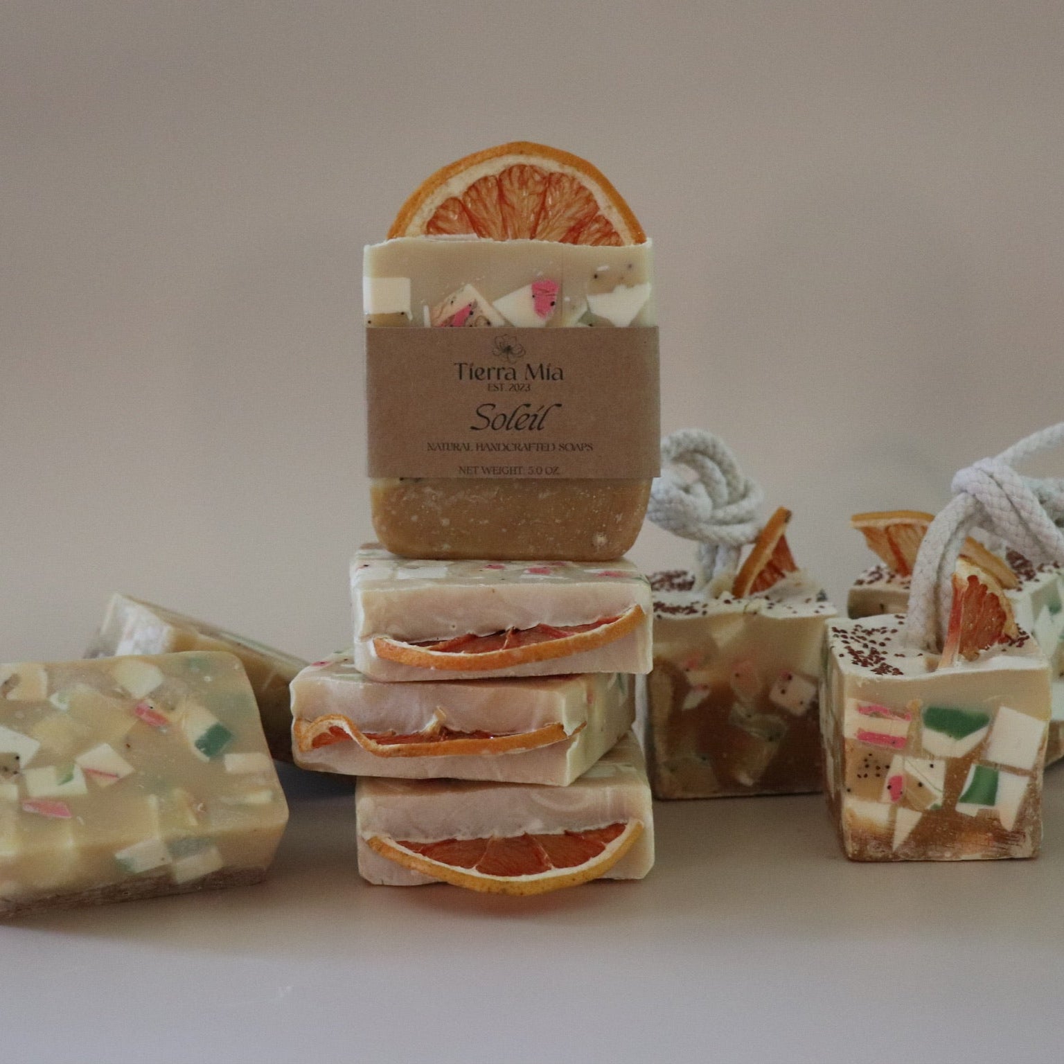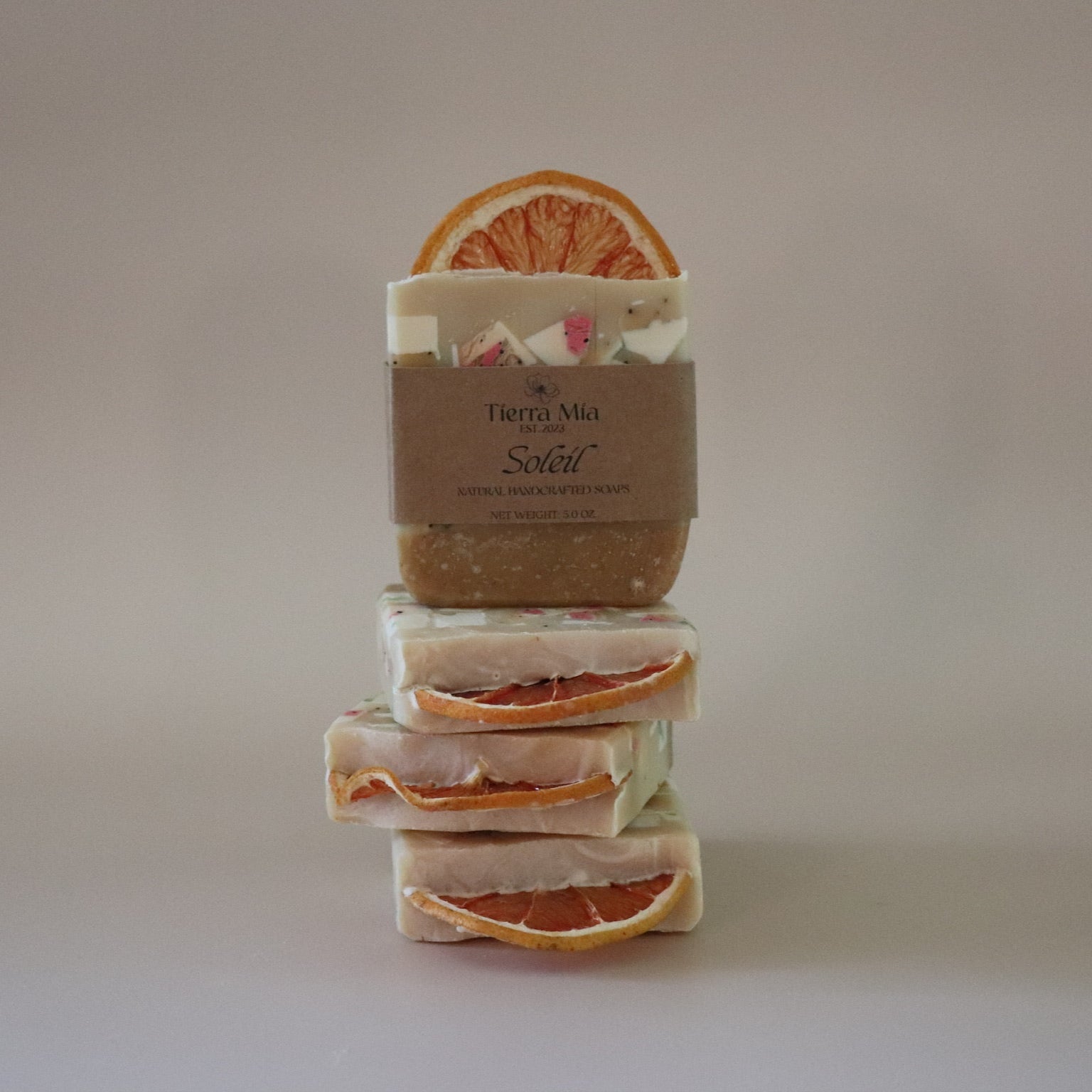 A celebration of summer sunshine, “Soleil” is a bright terrazzo-style soap bar bursting with golden orange tones and botanical flecks. Scented with a radiant essential oil blend of litsea cubeba, geranium, ylang ylang, and benzoin, this soap smells like sunlit citrus groves and floral gardens. Dried Orange Slices, Turmeric, and Orange Peel Powder provide both visual texture and skin-loving properties, while Mint & Sage infused Olive Oil delivers a crisp, herbal undertone.